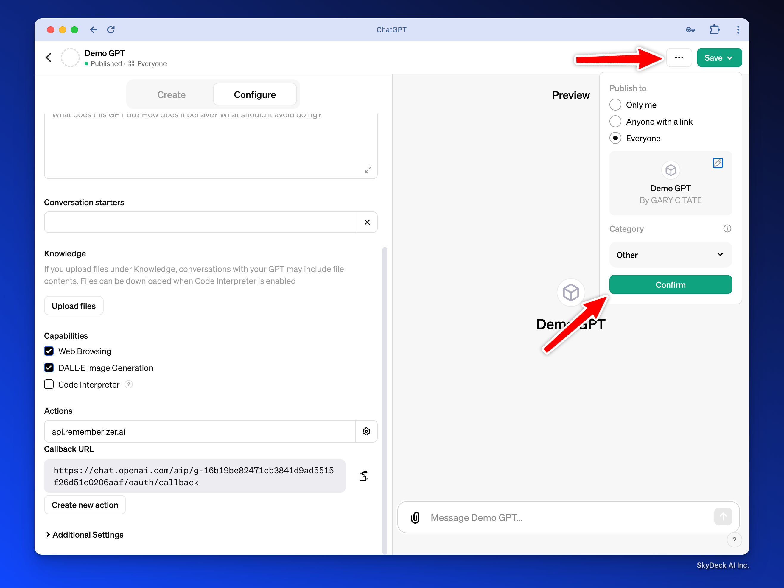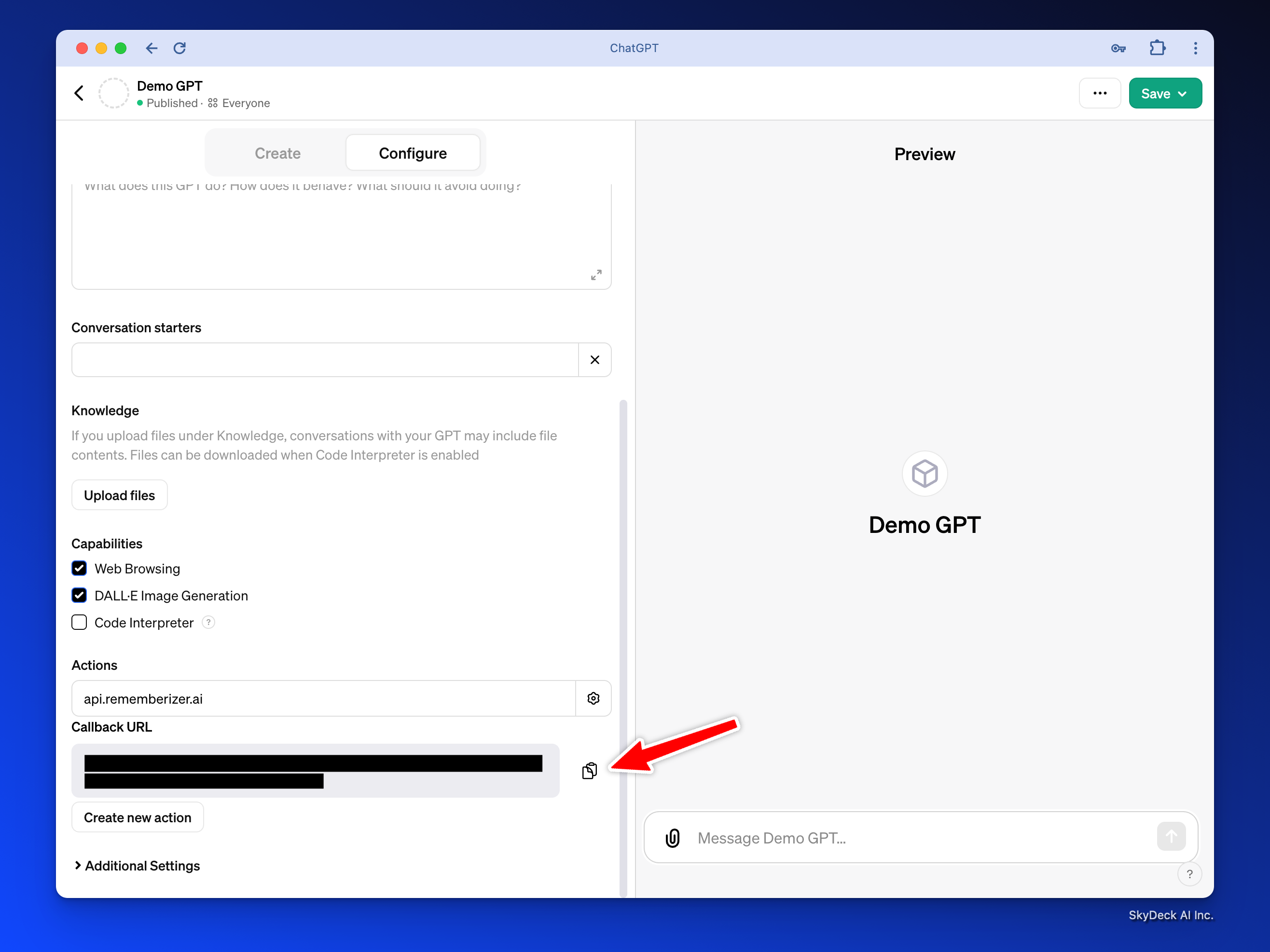 Rememberizer에 오신 것을 환영합니다! 이 가이드는 사용자에게 Rememberizer가 어떻게 귀하의 GPT 서비스를 향상시키는지를 보여주는 데모 GPT의 맞춤형 OpenAI GPT를 만드는 방법을 설명합니다. 우리는 앱 등록과 원활한 Rememberizer 통합을 작업으로 다룰 것입니다. 그런 다음, 귀하의 사용자는 콘텐츠 소스를 개인화된 동적 지식 기반으로 통합하여 귀하의 GPT와 상호작용합니다.