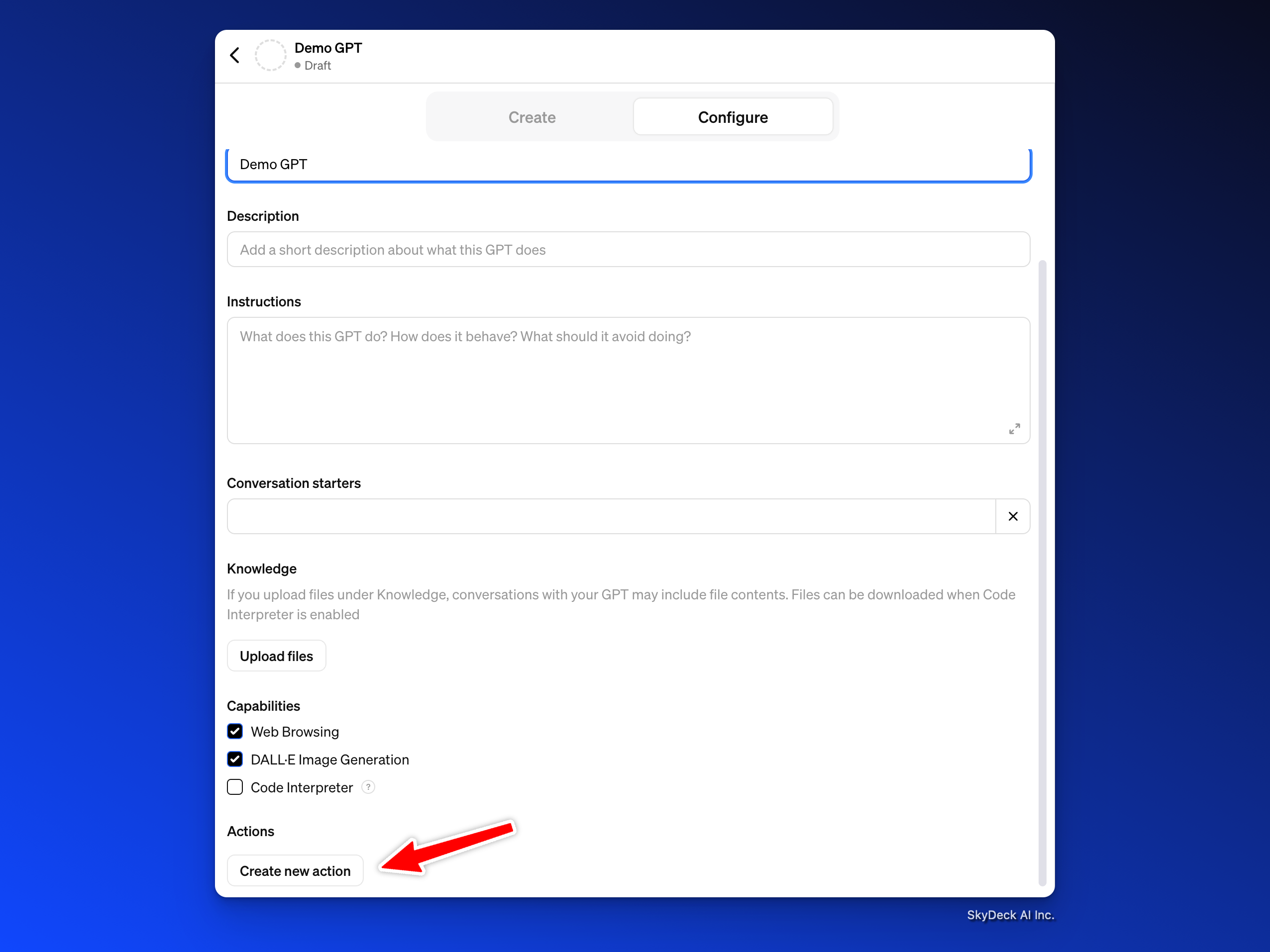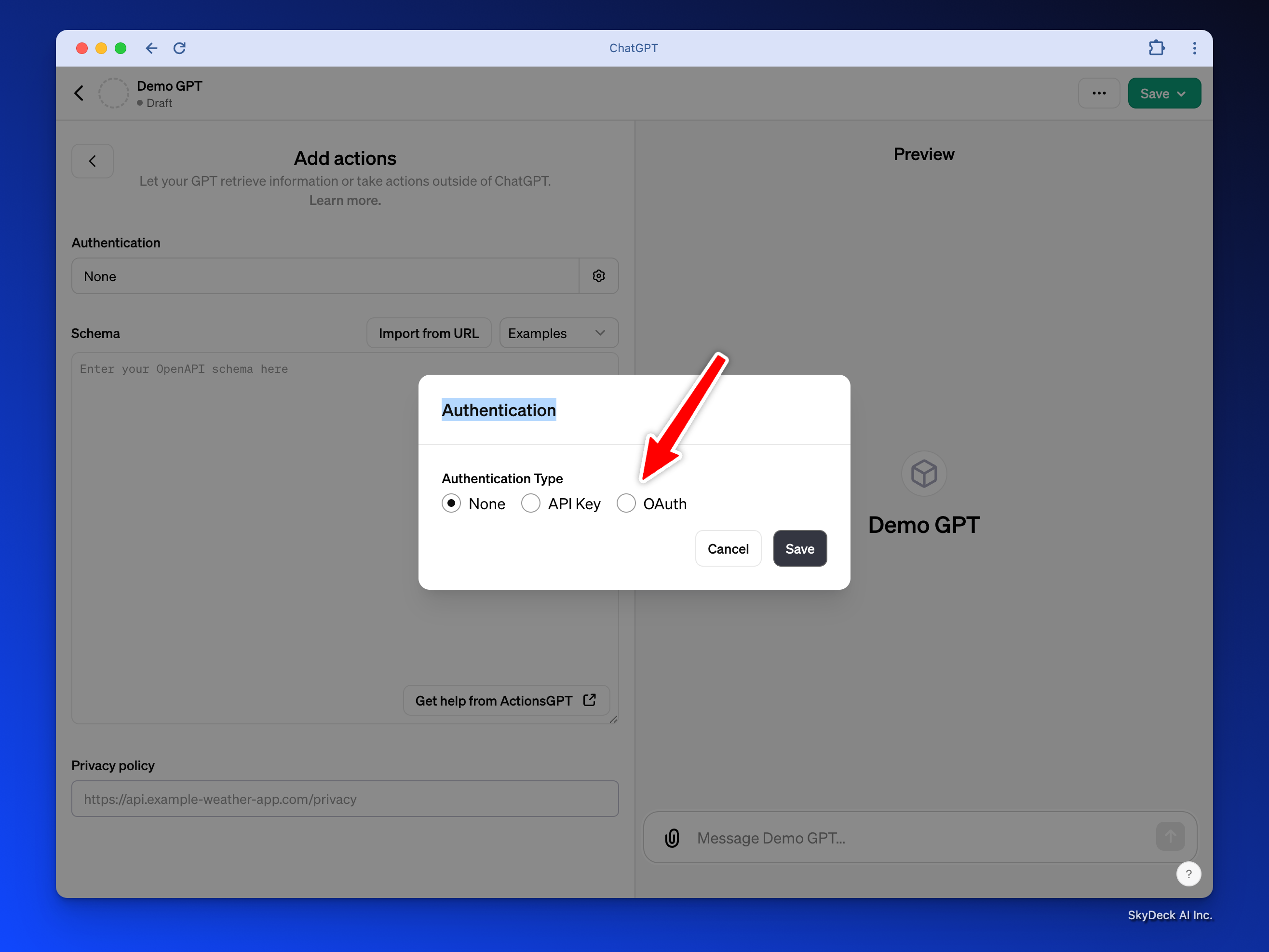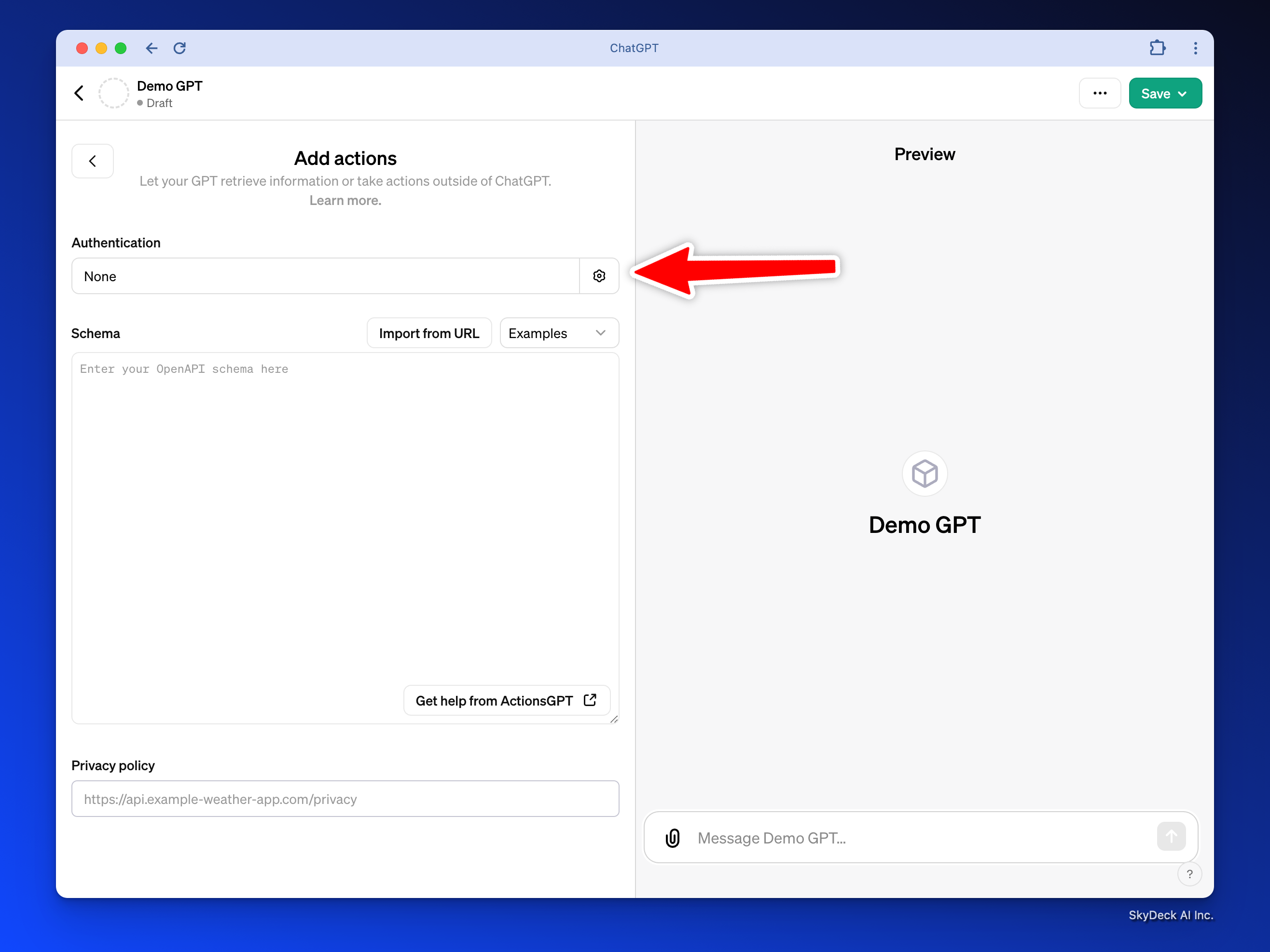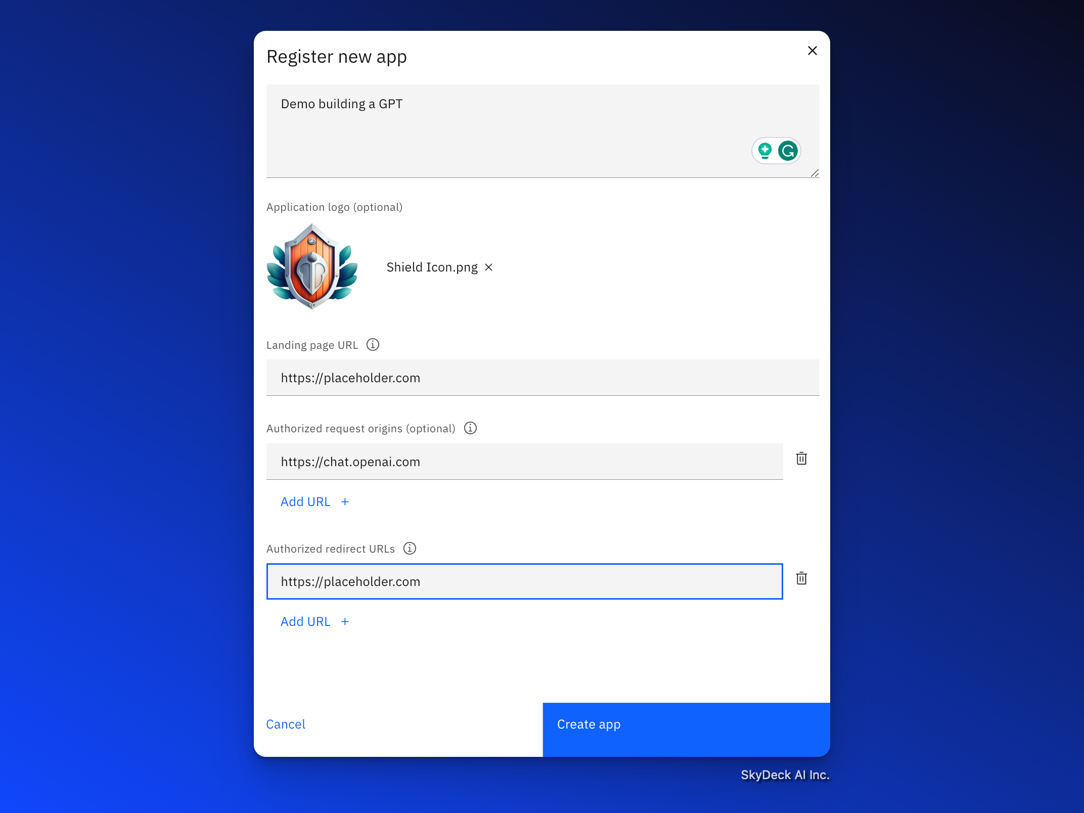 - "애플리케이션 이름”에 GPT 이름을 입력하세요; 예제에서는 Demo GPT를 사용할 것입니다.