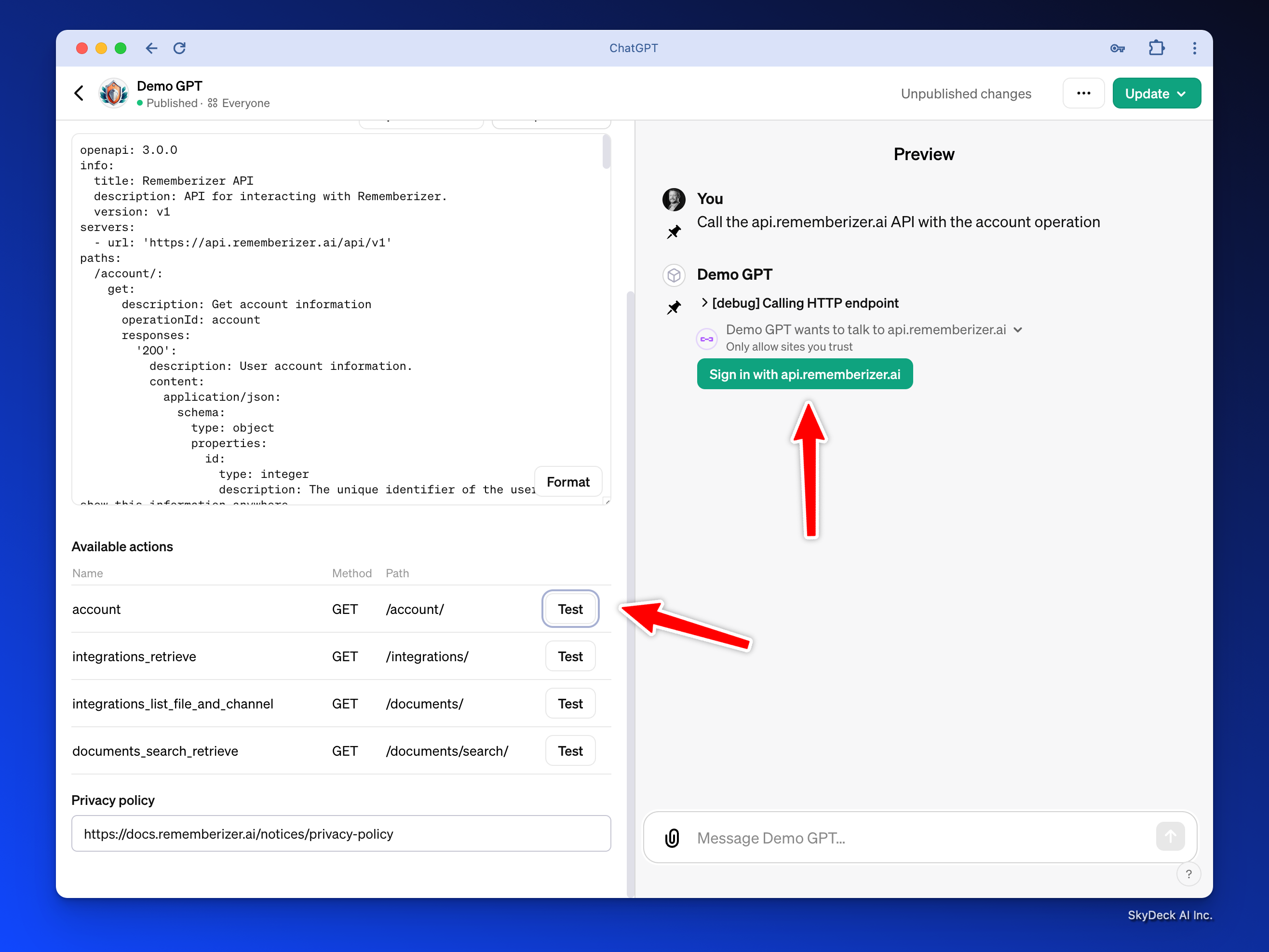 테스트를 진행하려면 사용자 계정을 생성하고 사용자의 GPT 테스트 과정을 거쳐야 합니다. 이를 위한 가이드를 여기서 확인하실 수 있습니다: https://try.rememberizer.ai/blog/rememberizer-gpt-a-first-time-user-guide