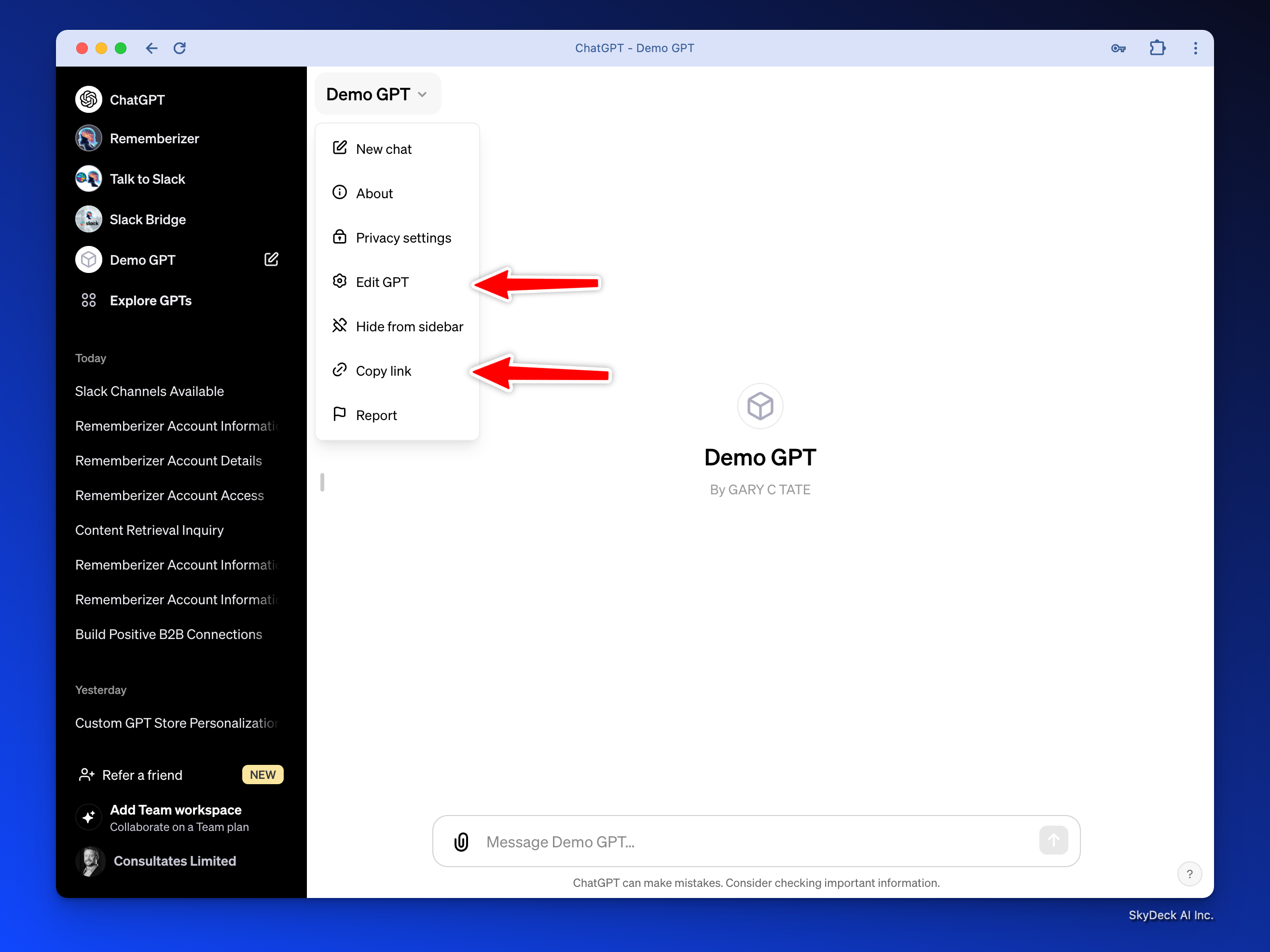 GPT의 링크를 복사하십시오. 링크는 다음과 비슷할 것입니다:https://chat.openai.com/g/g-dSiQf1hmQ-demo-gpt