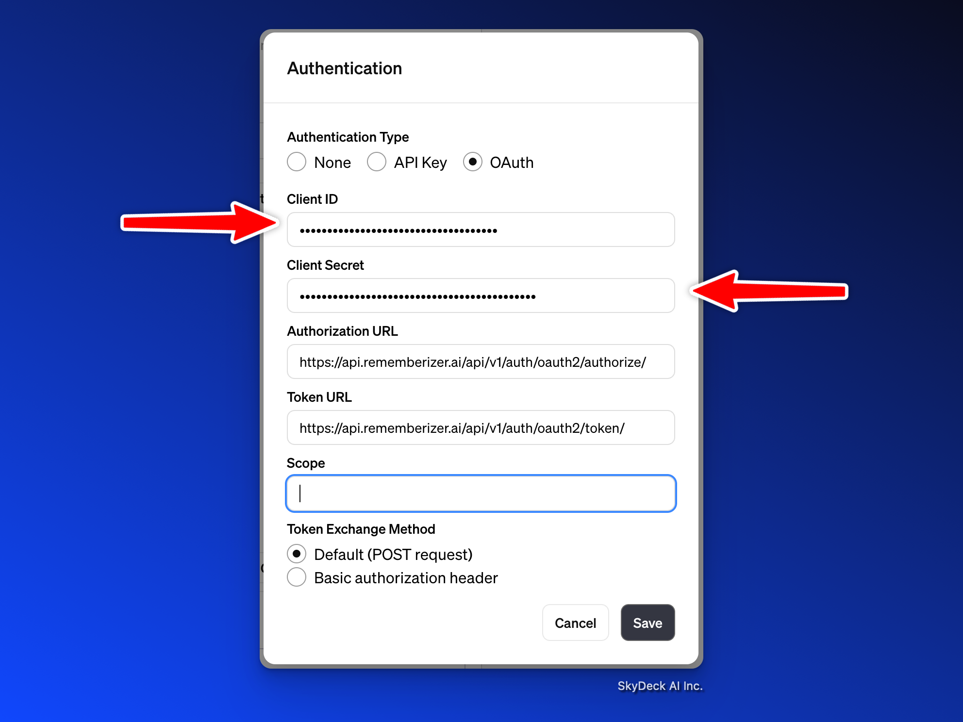 클라이언트 ID와 클라이언트 시크릿을 위의 Rememberizer 애플리케이션 자격 증명에서 붙여넣으십시오: