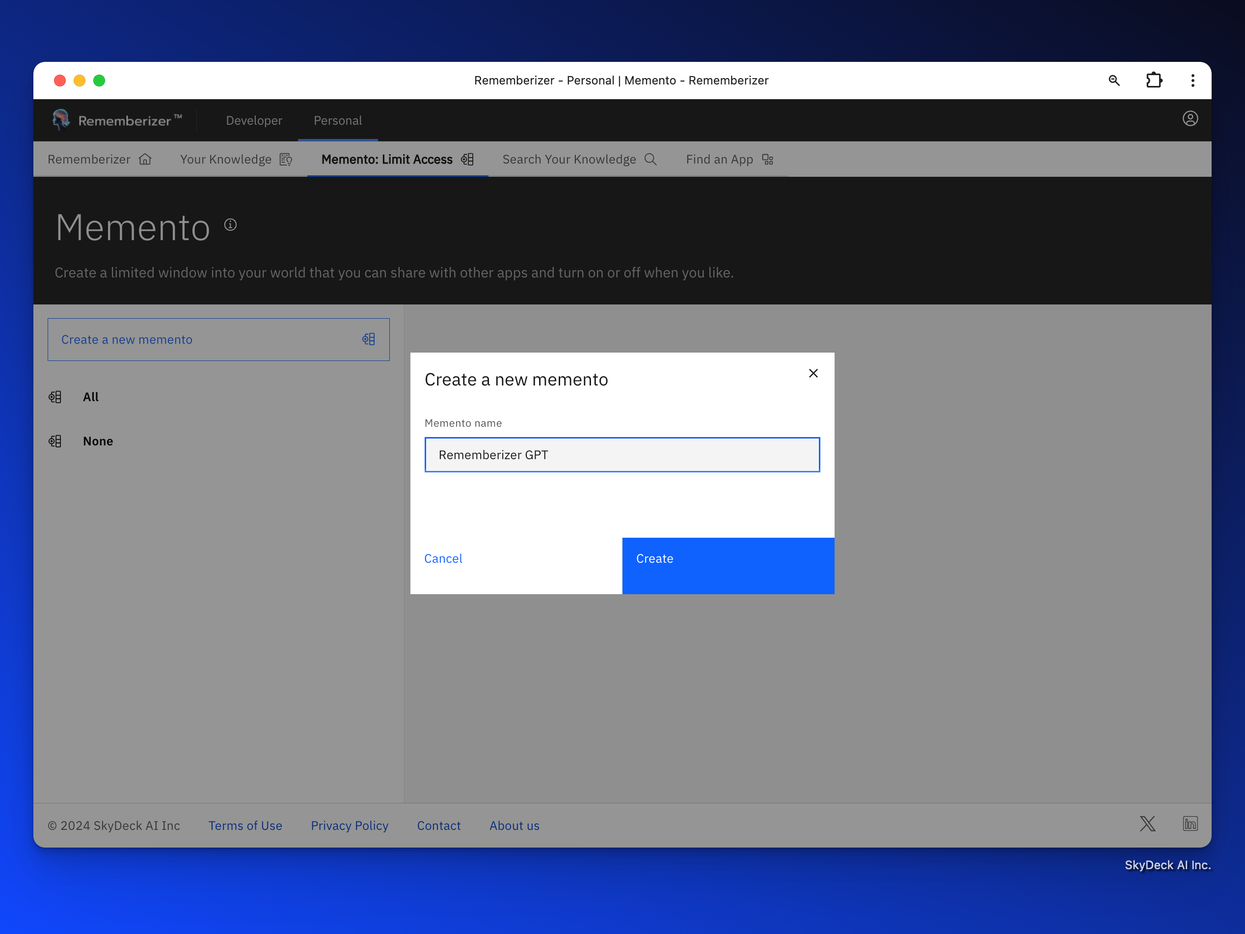 모든 데이터 소스가 연결되고 파일, 폴더, 대화 및 기타 콘텐츠가 이제 연결되어 인덱싱되었으므로, 다음 단계는 어떤 콘텐츠를 어떤 애플리케이션과 공유할지 결정하는 것입니다. 이는 Mementos를 통해 이루어집니다. Mementos는 연결된 소스에서 파일, 폴더 및 대화의 모음으로, 함께 그룹화되어 앱과 연결됩니다. 이는 두 번째 접근 제어 계층을 형성합니다.