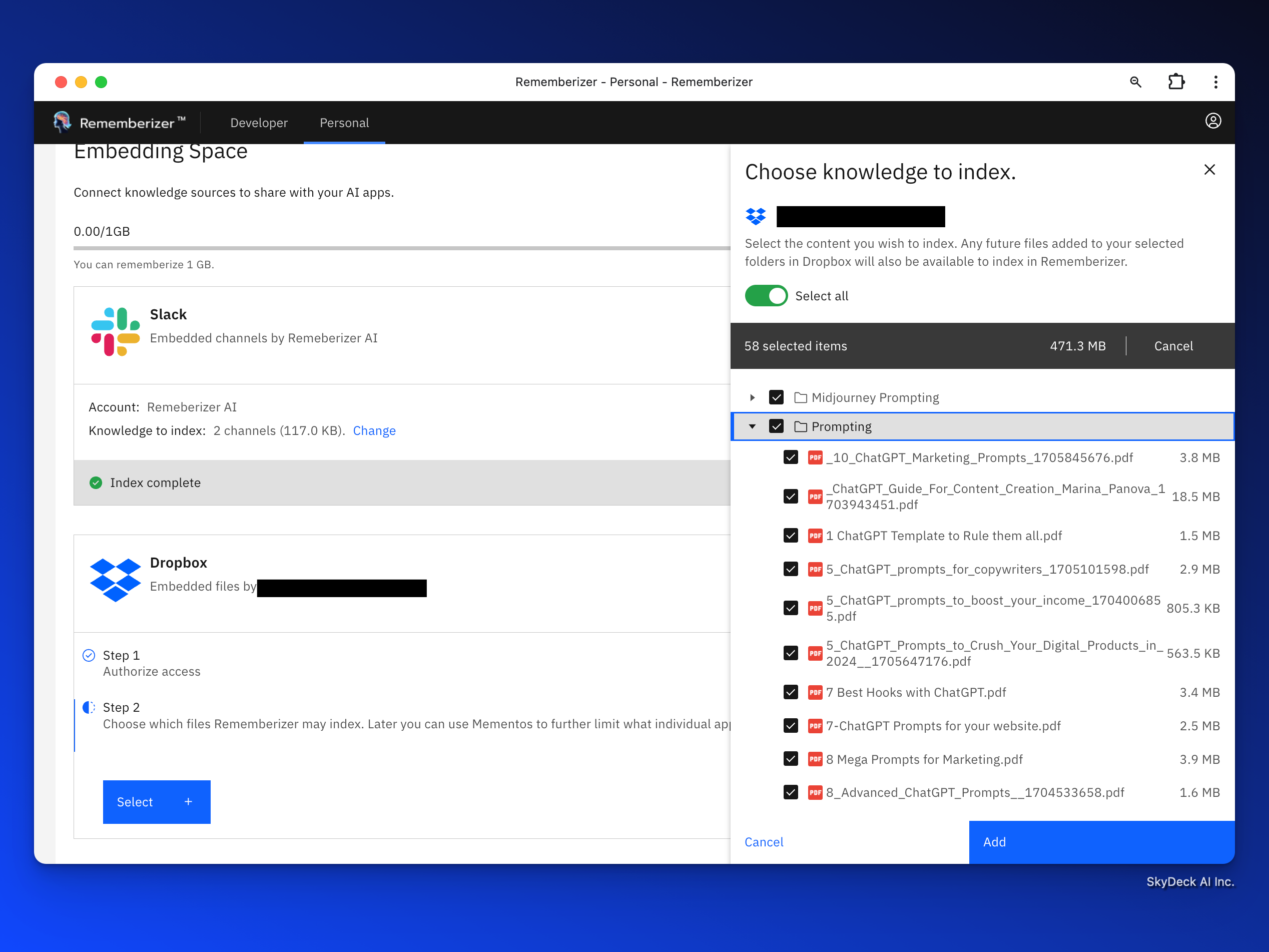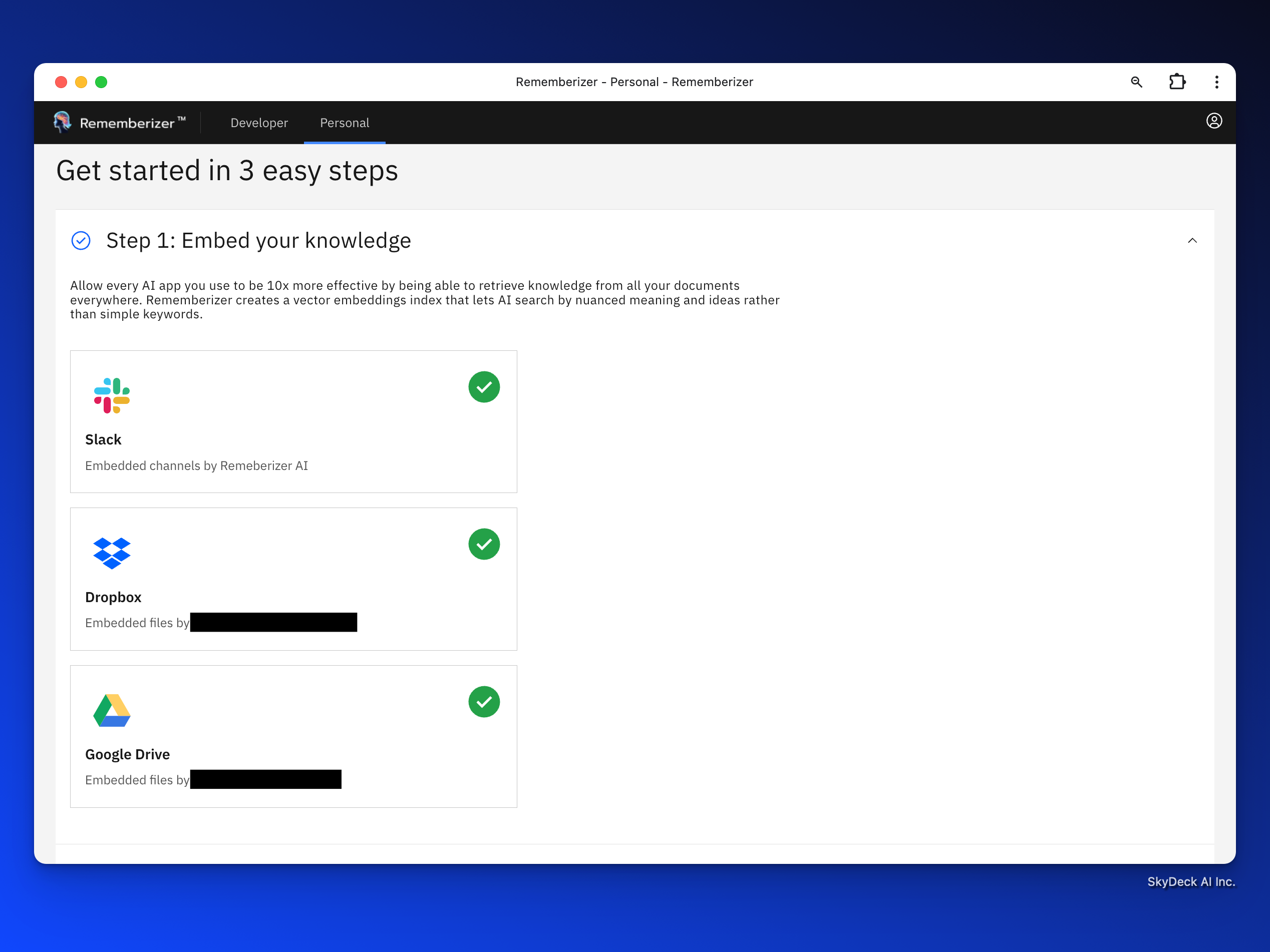 슬랙, 드롭박스, 구글 드라이브를 포함한 다양한 소스에서 Rememberizer로 콘텐츠를 선택하고 인덱싱하세요. 추가할 콘텐츠를 원하는 각 서비스를 연결하고 콘텐츠를 선택하세요.
