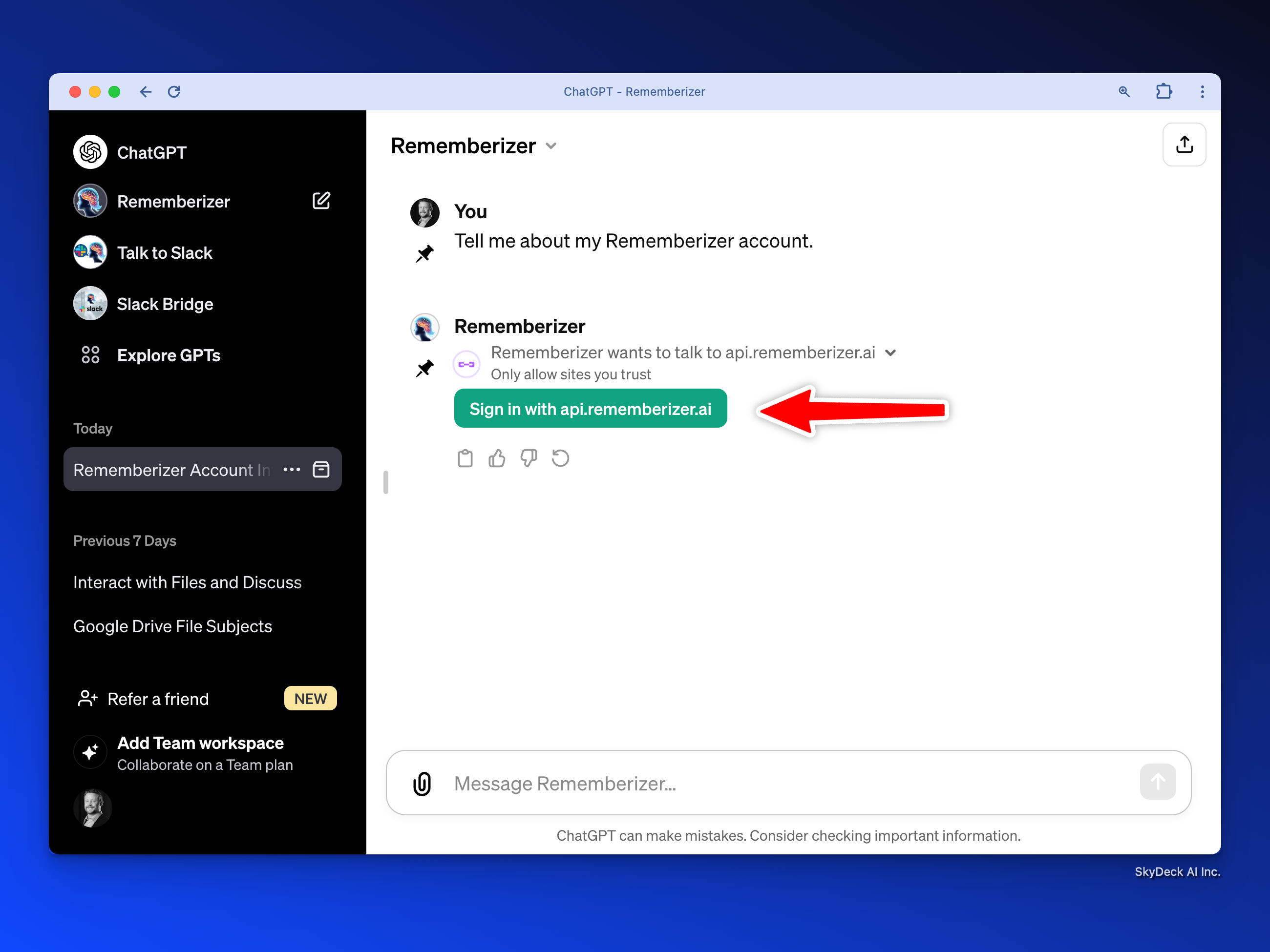 Rememberizer GPT의 GPT 스토어에서 “Tell me about my Rememberizer account.”를 클릭하면 Rememberizer와 함께 빠르고 쉽게 가입하는 프로세스가 시작됩니다.