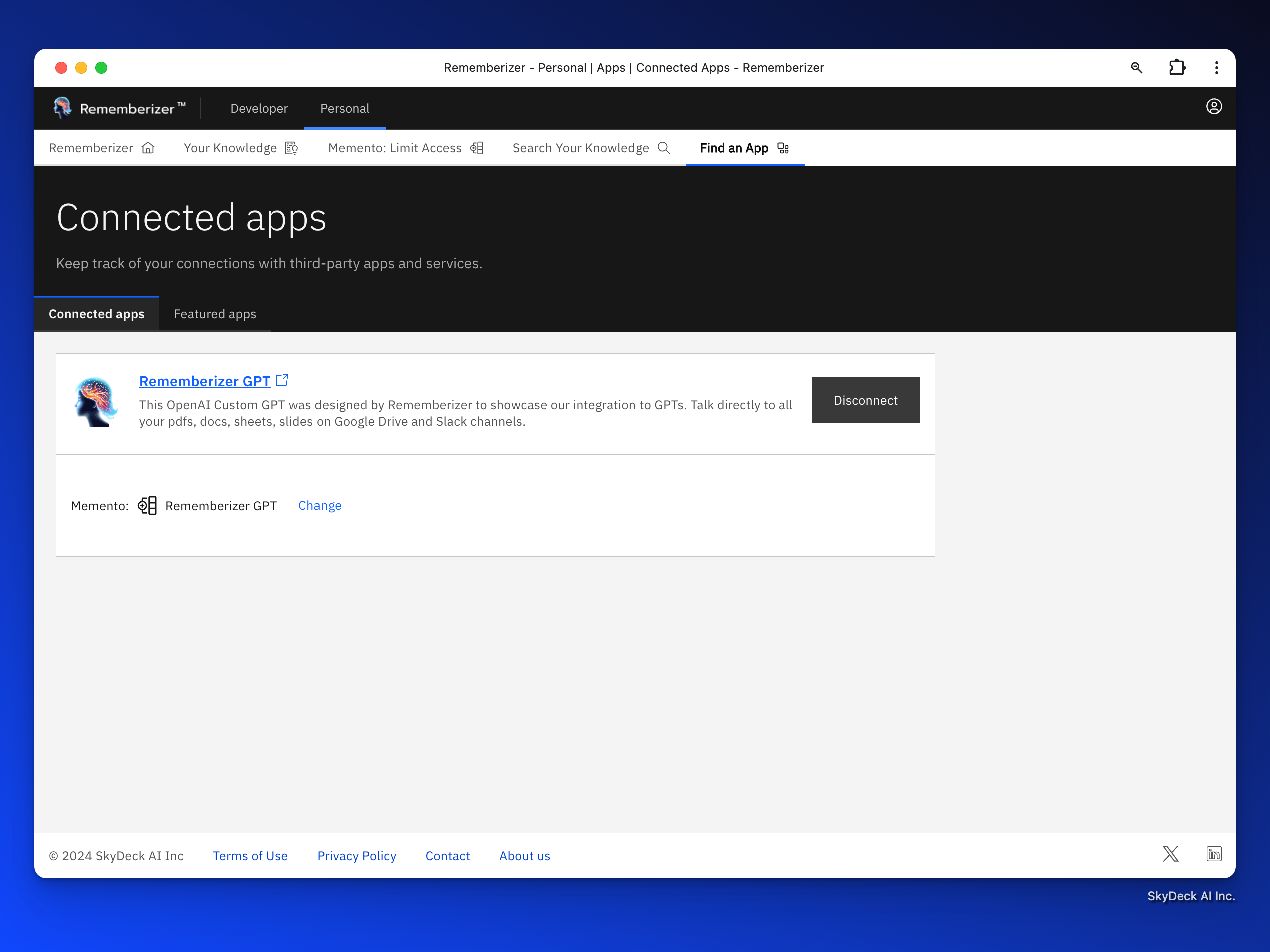 여기에서 연결된 앱을 찾을 수 있습니다. 연결된 앱에 연결하는 데 사용되는 Memento를 수정할 수 있습니다.